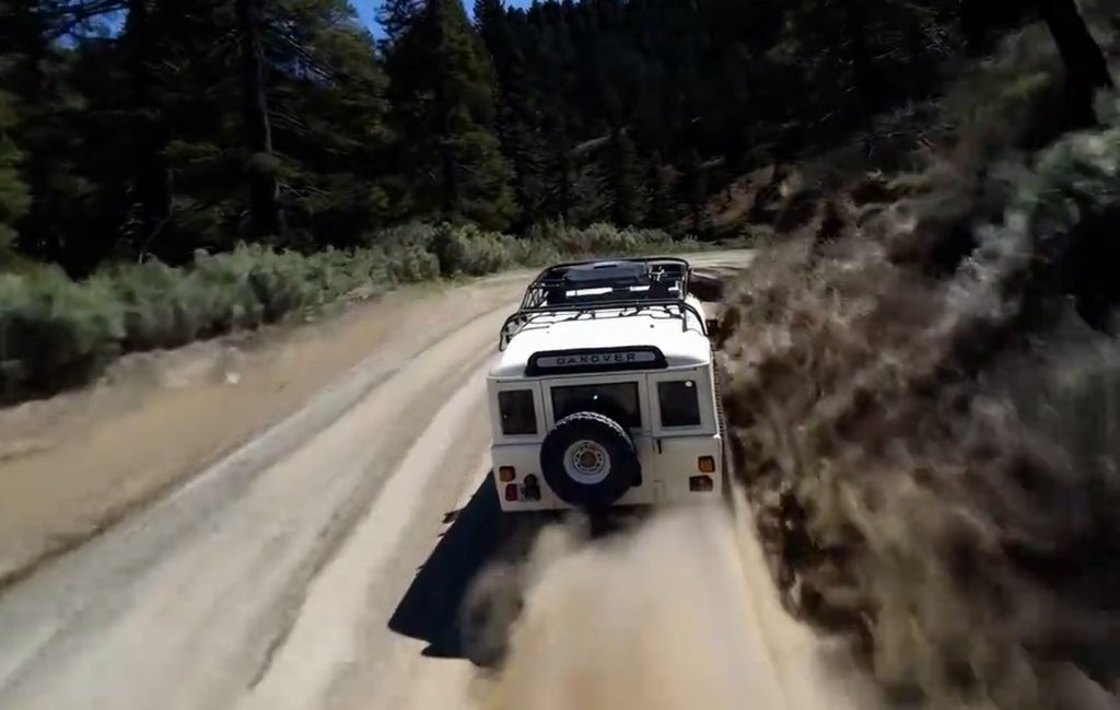 The camera follows behind a white vintage SUV with a black roof rack as it speeds up a steep dirt road surrounded by pine trees on a steep mountain slope, dust kicks up from it’s tires, the sunlight shines on the SUV as it speeds along the dirt road, casting a warm glow over the scene.